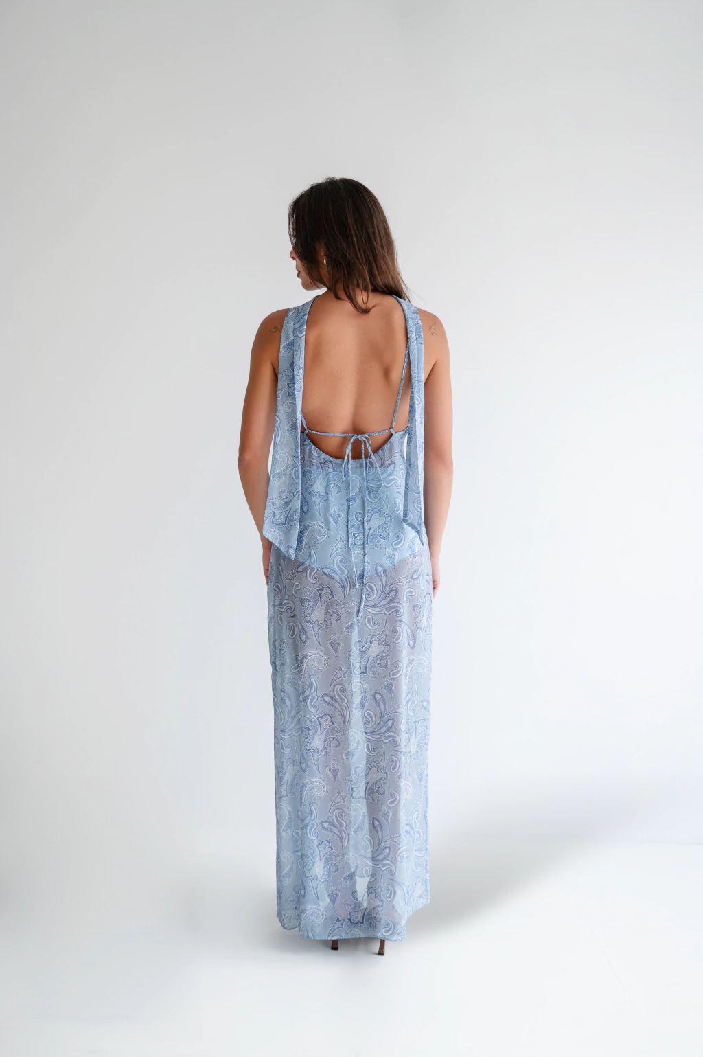 Com decote V profundo e alcinhas finas com amarração nas costas, valoriza o colo e as costas de forma sutil e feminina. O tecido leve e translúcido traz movimento e frescor, enquanto a estampa exclusiva em tons de azul cria um visual marcante e sofisticado.